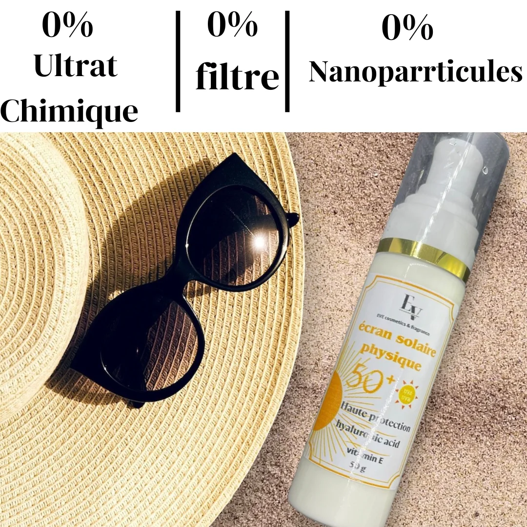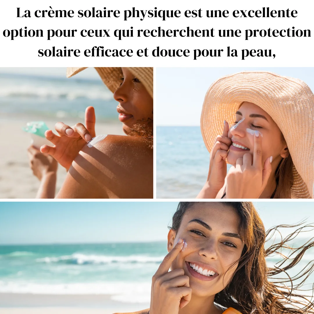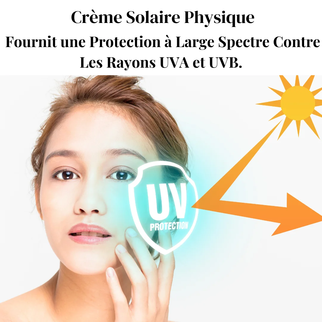 Une crème solaire physique, également connue sous le nom de crème solaire minérale, est un produit de protection solaire qui utilise des ingrédients actifs naturels, comme l'oxyde de zinc et le dioxyde de titane, pour protéger la peau des rayons ultraviolets (UV) nocifs. Contrairement aux crèmes solaires chimiques qui absorbent les rayons UV, les crèmes solaires physiques agissent comme un écran en réfléchissant les rayons UV loin de la peau.